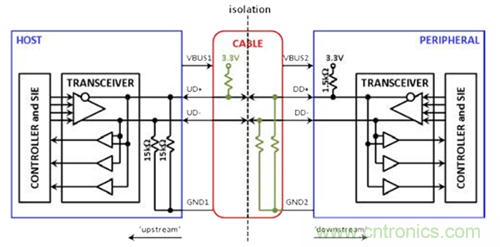 一種可能的隔離方法如圖2a所示。圖中,虛線表示隔離在理論上將USB電纜分割。D+和D–的狀態(tài)信息可以跨越隔離柵,但電流不能。GND1節(jié)點(上游的接地基準)現(xiàn)在與GND2節(jié)點(下游的接地基準)相互分離。不幸的是,隔離使主機無法“看到”下游的上拉電阻,而外設無法“看到”上游的下拉電阻。因此,需要使用一些額外的電阻,如圖2b所示,以便跨越隔離模仿相應連接。在這個“透明”概念中,主機與外設之間的通信方式和圖1中的非隔離式連接十分類似。透明的USB隔離器元件可方便地插入收發(fā)器和USB電纜之間,并使用隔離電源。原本設計用于非隔離式應用的主機和外設可方便地連接USB隔離器并交換標準USB信號,無需大幅改動設計。