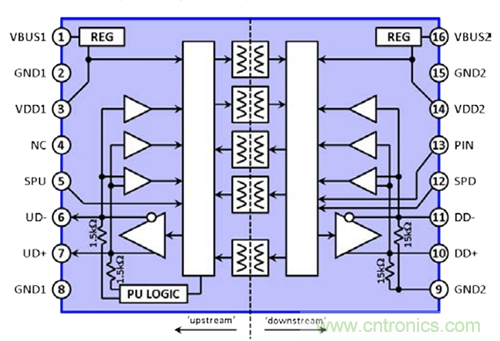 ADI的ADuM4160 USB數(shù)字隔離器2滿足全部要求,采用16引腳SOIC封裝。原理框圖如圖3所示。它包含一對USB收發(fā)器、5個基于iCoupler®的數(shù)字隔離通道、控制邏輯以及2個“智能調(diào)節(jié)器”。它還集成1.5 kΩ上游上拉電阻,以及15 kΩ下游下拉電阻。