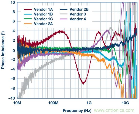 圖3揭示的HD2失真曲線方差量證明,需要進一步考察巴倫的性能,特別是相位和幅度不平衡。以下兩幅圖顯示了不同制造商的幾款巴倫的相位和幅度不平衡。使用網(wǎng)絡分析儀來測量不平衡。