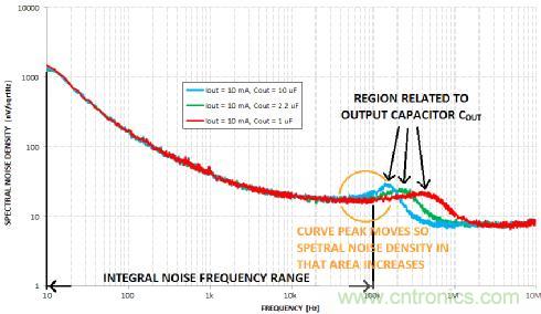 但是,如何表示LDO輸出的噪聲有多大呢?可用如上文所示的積分噪聲頻率范圍表示。這個范圍通常是10赫茲至100千赫。