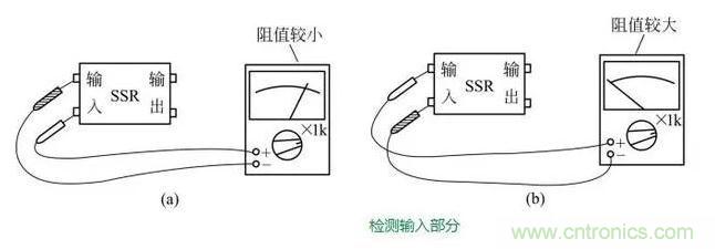 檢測固態繼電器時,將萬用表置于“Rx1K”檔,分別檢測其輸入部分和輸出部分。