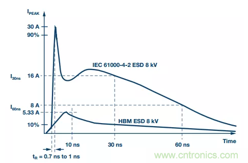 圖3:IEC 61000-4-2 ESD波形(8 kV)與HBM ESD波形(8 kV)的對(duì)比