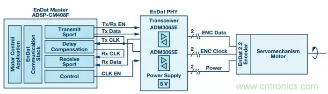 伺服驅(qū)動(dòng)器和ABS編碼器之間的RS-485通信鏈路通常要求最高達(dá) 16 MHz的高數(shù)據(jù)速率和低傳播延遲時(shí)序規(guī)格。RS-485線纜延伸長度最大值通常是50米,但有時(shí)候也可能長達(dá)150米。對(duì)數(shù)據(jù)通信而言,電機(jī)控制編碼器應(yīng)用是具有挑戰(zhàn)性的環(huán)境,因?yàn)殡姎庠肼暫烷L電纜會(huì)影響RS-485信號(hào)傳輸?shù)耐暾浴1疚闹攸c(diǎn)闡述電機(jī)控制應(yīng)用采用ADI50 Mbps (25 MHz) ADM3065E RS-485收發(fā)器和ADSP-CM40x混合信號(hào)控制處理器的主要好處。