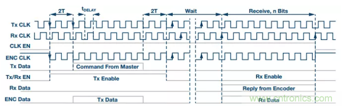 發(fā)送時(shí)鐘(Tx CLK)由處理器ADSP-CM40x產(chǎn)生。由于系統(tǒng)延遲,來自編碼器的數(shù)據(jù)在返回處理器之前會(huì)與發(fā)送時(shí)鐘錯(cuò)相。為補(bǔ)償傳輸延遲tDELAY,處理器還會(huì)產(chǎn)生一個(gè)接收時(shí)鐘(Rx CLK),它比發(fā)送時(shí)鐘延遲tDELAY。讓接收時(shí)鐘與自從機(jī)收到的數(shù)據(jù)同相是補(bǔ)償傳輸延遲的有效辦法。