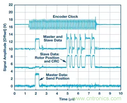 圖6顯示了EnDat系統(tǒng)的測(cè)試結(jié)果。測(cè)試使用的時(shí)鐘頻率為8 MHz,延遲補(bǔ)償通過接收時(shí)鐘相移實(shí)現(xiàn)。底部信號(hào)是來自EnDat主機(jī)的命令。此處顯示的命令為“發(fā)送位置”,其前面是兩個(gè)0,接著是六個(gè)1,最后又是兩個(gè)0。該命令總共有10位。編碼器的響應(yīng)是從頂部起的第三個(gè)信號(hào)。合并數(shù)據(jù)線是從頂部起的第二個(gè)信號(hào)。最后,頂部信號(hào)是施加于編碼器的時(shí)鐘。