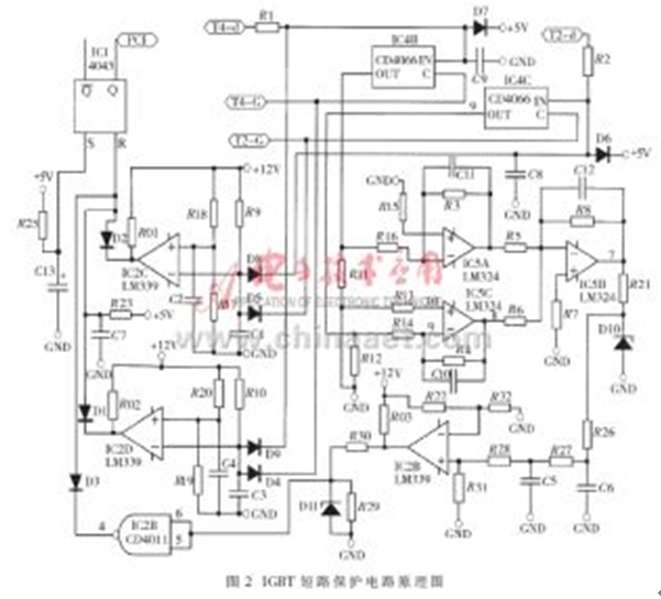 由對(duì)圖1所示電路的分析,可以得到IGBT短路保護(hù)電路的原理電路圖,如圖2所示。在圖2所示電路中, IC4及其外圍器件構(gòu)成選通邏輯電路,由IC5及其外圍器件構(gòu)成濾波及放大電路,IC2及其外圍器件構(gòu)成門(mén)限比較電路,IC1及其外圍器件構(gòu)成保持電路。正常情況下,D1、D2、D3的陰極所連接的IC2D、IC2C及CD4011的輸出均為高電平,IC1的輸出狀態(tài)不會(huì)改變。假設(shè)由于某種原因,在給T2發(fā)驅(qū)動(dòng)信號(hào)的時(shí)候,H型橋式PWM變換電路的左半橋下管T2的管壓降異常升高(設(shè)電平值為“高”),即T2-d端電壓異常升高,則該高電平UT2-d通過(guò)R2加在D8的陰極;同時(shí),發(fā)給T2的高電平驅(qū)動(dòng)信號(hào)也加在二極管D5的陰極。對(duì)IC2C來(lái)說(shuō),其反相輸入端為高電平,若該電平值大于同相輸入端的門(mén)檻電平值的話(huà),則IC2C輸出為“低”。該“低”電平通過(guò)D2加在R-S觸發(fā)器IC1的R輸入端,使其輸出端Q的輸出電平翻轉(zhuǎn),向控制系統(tǒng)發(fā)出IGBT故障報(bào)警信號(hào)。如果是由于右半橋下管T4的管壓降異常升高而引起IC2D輸出為“低”,則該“低”電平通過(guò)D1加在R-S觸發(fā)器IC1的R輸入端,使其輸出端Q的輸出電平翻轉(zhuǎn),向控制系統(tǒng)發(fā)出IGBT故障報(bào)警信號(hào)。由IC5A和IC5C及其外圍器件構(gòu)成的濾波及放大電路將選通電路送來(lái)的描述IGBT管壓降的電壓信號(hào)進(jìn)行預(yù)處理后,送給由IC5B構(gòu)成的加法器進(jìn)行運(yùn)算處理。若加法器的輸出電平大于由R22和R32確定的門(mén)檻電平,則會(huì)使R-S觸發(fā)器IC1的R端的第三個(gè)輸入端為“低”,也向控制系統(tǒng)發(fā)出IGBT故障報(bào)警信號(hào)。改變由R22和R32確定的門(mén)檻電平,就可以靈活地改變這第三路報(bào)警信號(hào)所代表的物理意義,從而靈活地設(shè)計(jì)保護(hù)電路。圖2中的端子T4-d、T2-d,分別接在T4、T2的集電極上,T4-G、T2-G分別接IGBT器件T4、T2的驅(qū)動(dòng)信號(hào)。在電路設(shè)計(jì)時(shí)應(yīng)該特別注意的是,D8、D5、D9、D4必須采用快速恢復(fù)二極管。