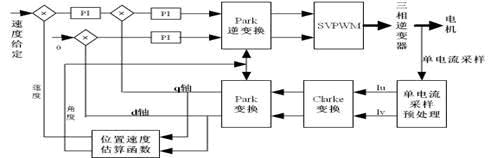 電機通過單電流采樣得到兩個采樣電流值,通過電流識別方法,計算出三相電流,利用Clarke和Park變換將電流映射到d、q坐標系下,估算出角度和速度值,通過結合了積分分離的PI控制算法,完成對電機的反饋控制,然后經過Park逆變換,生成了新的SVPWM波,完成一次循環。這里用到的位置、速度估算函數由于篇幅所限,將另做描述。