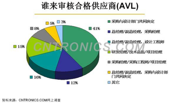 誰能審核和最終決定合格供應(yīng)商名單呢?這是電子元器件制造商和分銷商最為關(guān)心的問題,從調(diào)查數(shù)據(jù)中可以看出,決策權(quán)并不限于某一個(gè)部門。趨于四成的公司審核和決定合格供應(yīng)商名單(AVL)是由采購與設(shè)計(jì)部門共同決定,由采購部門單獨(dú)決策的不足一成;而由研發(fā)部門單獨(dú)決策的僅為15%,由此可見,在電子產(chǎn)品開發(fā)速度加快和上市時(shí)間日趨壓縮的背景下,電子行業(yè)的采購與研發(fā)的合作關(guān)系日趨緊密,采購部門更多的參與到產(chǎn)品開發(fā)的過程中,在提供成本預(yù)測、確定替代供貨源和降低成本方面扮演著重要角色。此外,通過調(diào)查還發(fā)現(xiàn),多個(gè)部門共同決定元器件采購,已經(jīng)成為業(yè)界采購流程的發(fā)展趨勢。除研發(fā)和采購部門外,公司總經(jīng)理等決策高層也更多的關(guān)注和參與到電子元器件采購中。