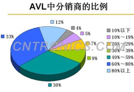 在合格供應(yīng)商清單(AVL,Approved Vendor List)中,有超過1/3的電子整機(jī)廠商的AVL中分銷商比例超過六成,1/3的整機(jī)廠商的AVL中分銷商占據(jù)半壁江山。總體有超過2/3的整機(jī)廠商中有一半的產(chǎn)品供應(yīng)來自分銷商。可見分銷商在電子元器件供應(yīng)鏈中扮演重要角色。