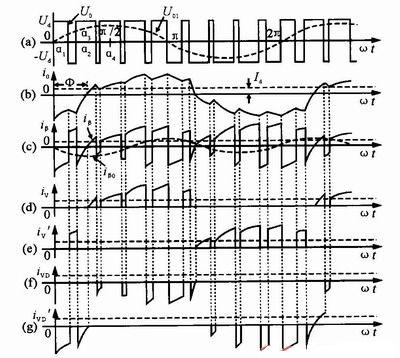 通過比較可知,因?yàn)槔m(xù)流的緣故,死區(qū)時(shí)間內(nèi)A、B點(diǎn)的電位不再為零。當(dāng)i>0時(shí),VD2、VD3續(xù)流形成回路,A端電位UA為-Ed/2,B端電位UB為+Ed/2;當(dāng)i<0時(shí),VD1、VD4續(xù)流形成回路,A端電位UA為+Ed/2,B端電位UB為-Ed/2。
