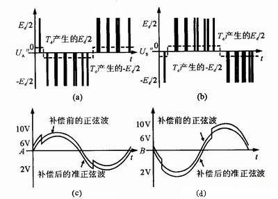 在死區(qū)時(shí)間內(nèi),由于續(xù)流的緣故輸出電壓波形發(fā)生了畸變,通過對(duì)波形進(jìn)行等效的補(bǔ)償可以得到準(zhǔn)正弦波。推理和實(shí)驗(yàn)均證明該方法能較好地對(duì)逆變器橋路輸出電壓進(jìn)行補(bǔ)償。該方法簡單實(shí)用,易于實(shí)現(xiàn),具有一定的工程使用價(jià)值。