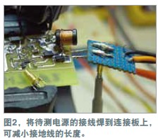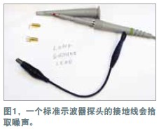 在測(cè)量電源軌的紋波時(shí),必須盡量減小噪聲,因?yàn)榧y波幅度可能很小。示波器探頭是基本的測(cè)量工具,但它們可能引入噪聲與誤差。地線(如與標(biāo)準(zhǔn)示波器探頭連接的那根線)可能增加一些不會(huì)出現(xiàn)在示波器軌跡上的電路噪聲。線路環(huán)就像一根天線,會(huì)提取周圍的雜散磁場(chǎng)。環(huán)路面積越大,提取的噪聲就越多。為證明這個(gè)理論,可將示波器地線連接到探頭尖端,然后到處移動(dòng)。示波器會(huì)隨著地線的移動(dòng)而顯示出噪聲的增減。用一個(gè)示波器探頭及其地線和插座可以做一個(gè)簡(jiǎn)單的連接板(圖1)。