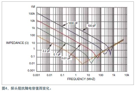 電容應(yīng)采用多層堆疊式的瓷片電容,因?yàn)樗芨玫厝ヱ罡哳l噪聲。電解電容、紙電容以及塑料薄膜電容都有兩片金屬箔。金屬箔由一片電介質(zhì)分隔開(kāi),這三部分構(gòu)成一個(gè)卷狀物。這種結(jié)構(gòu)有自身的電感;因此,當(dāng)頻率高于數(shù)兆赫茲時(shí),它更類似于一只電感,而不是電容。圖4顯示了各種堆疊式瓷片電容值對(duì)電源的阻抗。
