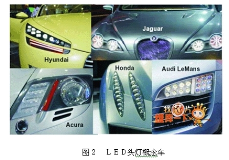 從LED的應(yīng)用歷史來看,早在1992年時已經(jīng)有LED應(yīng)用于第三剎車燈上的先例;而在2000年時則進(jìn)一步的應(yīng)用于尾燈、轉(zhuǎn)向燈與剎車燈;到了2002年Audi A8率先將LED光源置于前置燈具內(nèi)作為日行燈,開啟了設(shè)計師與工程師們在前置燈具的想象空間。在之后的許多國際車展上都可以看到LED作為前照燈源的概念車,如圖2所示。