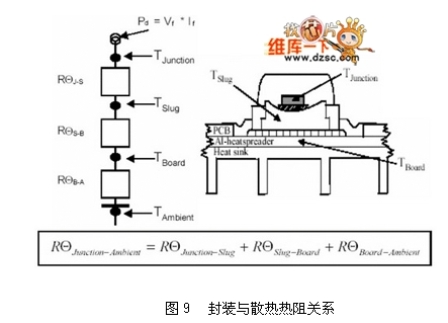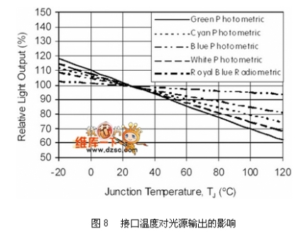 散熱設(shè)計是LED光源區(qū)別于傳統(tǒng)光源的課題之一。傳統(tǒng)燈具產(chǎn)生的熱遠(yuǎn)高于LED,但傳統(tǒng)燈具不會因為高溫而降低其光源輸出能力,但LED的光輸出卻會隨著本身接口(Junction, PN接口)溫度的升高而下降,如圖8所示。而其產(chǎn)生的熱如何散除到外界環(huán)境與其封裝結(jié)構(gòu)材料息息相關(guān),牽涉到使用的散熱材料與相關(guān)外型,關(guān)系如圖9所示,其中熱阻的概念,代表輸入W功率時,需要提高多少K溫度才足以散熱。以現(xiàn)有的封裝技術(shù)最高可允許LED操作在185℃(Lumiled K2),但一般因為封裝膠材的關(guān)系,可允許的操作溫度約在125℃,除了考慮光源輸出效率之外,亦考慮封裝膠材的變質(zhì)(樹脂類材料在高溫有老化現(xiàn)象)。