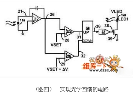 在(圖四)中,標記為22的積分電路可以輸出一個受到光二極管(11a)上光量控制的電壓,這個電壓與VSET比較,比較器的輸出能控制計數器數值的增加或減少,計數器的輸出則是用來推動一個數字模擬轉換器(37),進而控制LED的驅動電流。