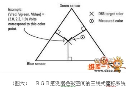 (圖六)以不同的方式描述這個概念,所有可能的目標色設定點透過由紅、綠與藍光感測器所形成的RGB感測器色彩空間內座標值來指定,當LED的特性改變時,所測得的色彩就會偏離目標,ASSP將會偵測到這個改變并隨時依情況調整LED的PWM信號輸出。