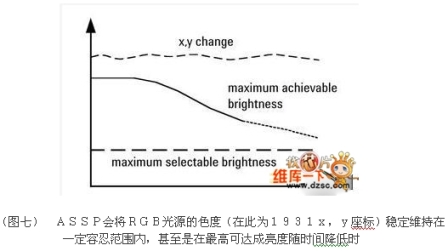 另一點相當重要,同時必須注意的是,當LED使用時間越久,光輸出強度就會降低,因此經過一段時間后,RGB LED系統的最大可輸出亮度將會下降,雖然在大部分的應用事實上都可以接受逐漸且穩定的亮度衰減,但有時無法接受的是RGB發光系統色度的變化,ASSP擁有能夠穩定控制RGB發光系統光度衰減的功能,例如維持色度的穩定在一定的容忍度內,甚至當最高可輸出亮度下降時。