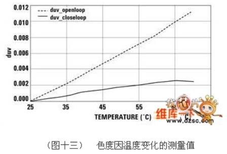 (圖十三)顯示了開回路與閉回路RGB光源系統的效能差別,實驗采9000K白色目標色進行并使用duv做為評比指標。