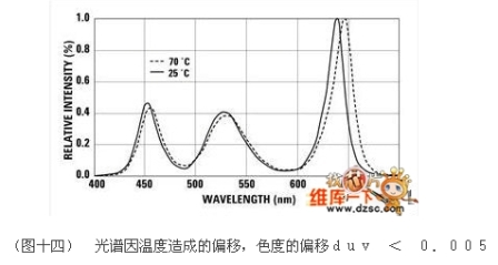 (圖十四)描述了溫度上升時對LED光譜的重大影響,這項資料由9000K白光目標色的閉回路系統取得,雖然光譜曲線出現大幅度的偏移,但duv依然維持在0.005以下。