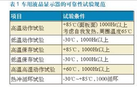 車用液晶顯示器最基本的要求特性就是耐環境性,表1是車用液晶顯示器的可靠性試驗規范。隨著汽車廠商的不同,要求條件更嚴苛的耐環境試驗,例如高溫+ 95℃、低溫-40℃,高溫高濕65℃、濕度90%,試驗時間2000小時等特性,面臨這種情況,業者利用隨機抽樣樣品進行試驗,確認使用上完全符合耐環境試驗要求的特性。