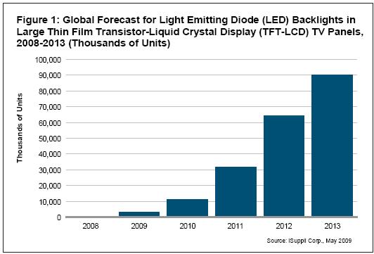 圖1所示為iSuppli公司對于2008-2013年全球LED電視面板市場的預測。