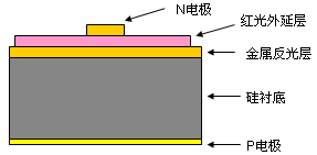 高亮度紅光LED芯片是一種亮度高、可靠性好的發(fā)光器件。相對于普通結(jié)構(gòu)的紅光LED芯片,高亮度紅光芯片采用鍵合工藝實(shí)現(xiàn)襯底置換,用到熱性能好的硅襯底(硅的熱導(dǎo)率約為1.5W/K.cm)代替砷化鎵襯底(砷化鎵的熱導(dǎo)率約為0.8W/K.cm),芯片具有更低熱阻值,散熱性能更好,有利于提高可靠性。另外,在P-GaP上鍍反射層,比普通紅光外延層中生長DBR反射鏡出光效率更高。為了克服光在芯片與封裝材料界面處的全反射而降低取光效率,還在芯片制作一些表面紋理結(jié)構(gòu)。相同尺寸相同波長的芯片,20mA電流下,兩者光強(qiáng)相差兩倍以上,圖-1是高亮度紅光芯片剖面示意圖。圖-2是芯片實(shí)物圖片.