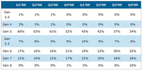表一 : Q1’08到Q4’09桌上型顯示器面板各世代線的產出比例