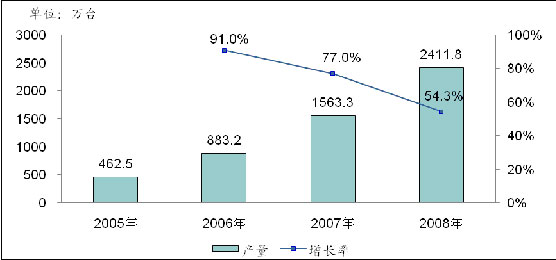 隨著傳統CRT彩電的逐漸被取代,液晶電視的普及已經成為不可逆轉的趨勢,并且普及的速度在不斷加快。中國作為全球最大的彩電制造基地和彩電消費市場,在彩電工業的轉型過程中,液晶電視的產量也出現了爆發式的增長。根據賽迪顧問統計,2005年-2008年,中國液晶電視產量的年均復合增長率高達73.4%,2008年產量達到2411.8萬臺。