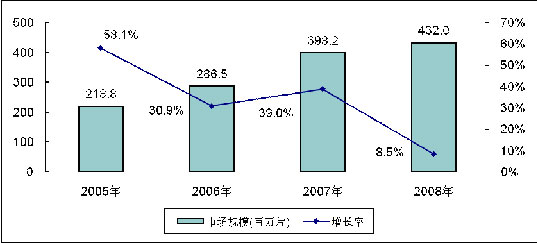 2008年受全球金融危機的影響,液晶面板的市場需求量出現大幅萎縮。2008年全球大尺寸(大于10英寸)TFT-LCD面板銷售量達到4.32億片,比去年3.98億片的銷售量僅僅增長8.5%,遠低于2007年39.0%的增長率,創近5年市場增長率最低。