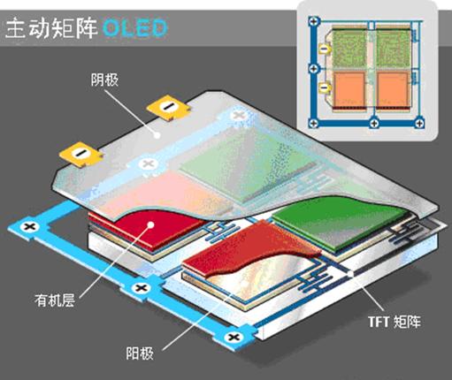 與TFT-LCD類似,OLED也可以做成“TFT-OLED”,以提高OLED的瞬態響應性能,不過“TFT-OLED”人們卻用另一個名字來稱謂,它被稱為主動矩陣OLED (Active Matrix/Organic Light Emitting Diode,簡稱AM-OLED),如圖10所示。