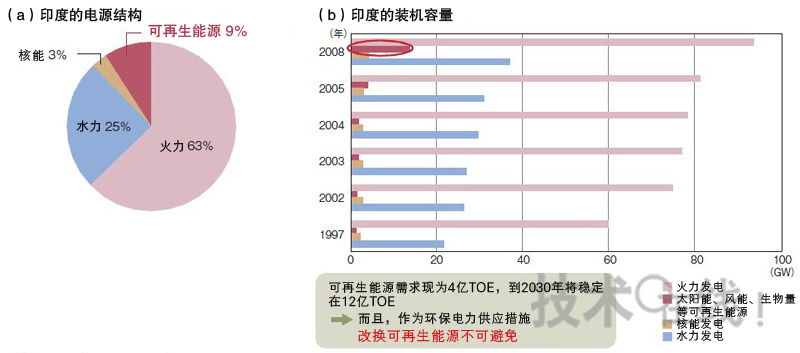 圖2:火力發(fā)電占主流印度各發(fā)電方式的裝機容量結構比與變化?;鹆Πl(fā)電,尤其是煤炭火力發(fā)電占壓倒性優(yōu)勢。從穩(wěn)定供電和環(huán)保角度出發(fā),改用可再生能源已刻不容緩