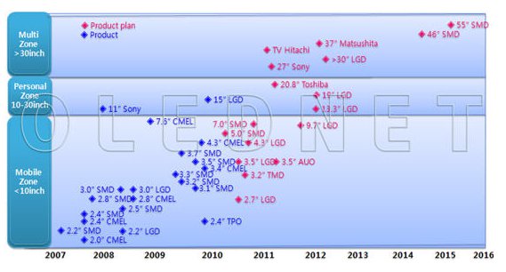 報告中還指出SMD將在2010年生產5.0英寸和7.0英寸的AMOLED面板。LG顯示器(LGD)將在2010年生產2.7英寸和4.3英寸AMOLED面板用于數碼相機和便攜電視,還將生產3.0英寸WQVGAAMOLED和3.5英寸WVGAAMOLED面板用于手機。日本東芝、松下和日立將于2011年推出20-40英寸的OLED電視面板。