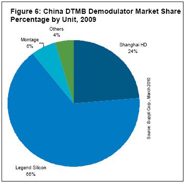 圖6所示為2009年各廠商在中國(guó)DTMB解調(diào)器市場(chǎng)的占有率。