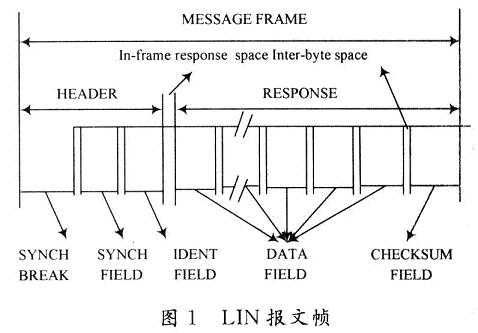 報文幀的報文頭包括一個同步間隔場(SYNCHBREAKFIELD)、一個同步場(SYNCHFIELD)和一個標識符場(IDENTITYFIELD)。報文幀的響應(RESPONSE)則由3~9個字節場組成:2,4或8字節的數據場(DATAFIELD)和1個字節的校驗和場(CHECKSUMFIELD)。字節場由字節間空間分隔,報文幀的報文頭和響應是由一個幀內響應空間分隔。最小的字節間空間和幀內響應空間是0。