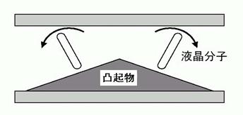 如圖,它依*叫做Protrusion的屋脊狀凸起物來使液晶本身產(chǎn)生一個預傾角(Pre-tiltAngle)。這個凸起物頂角的角度越大,則分子長軸的傾斜度就越小。早期的VA模式液晶凸起物只在一側,後期的MVA凸起物則在上下兩端。