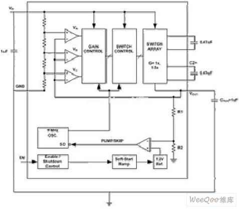 下調(diào)的輸出電壓通過PUMP/SKIP比較器與1.2V的電壓基準(zhǔn)比較。PUMP/SKIP比較器輸出電壓在啟動時線性上升,提供軟啟動功能。當(dāng)輸出電壓超過期望的極限,器件不會開啟,消耗的電源電流將很小。在這種空閑狀態(tài)的期間,輸出電容CHOLD提供輸出負(fù)載電流。隨著這個電容不斷放電以及輸出電壓降低到期望的輸出電壓以下,電荷泵被激活直到輸出電壓再次達(dá)到高于這個值。