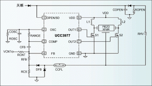 一個以諧振推挽拓撲控制壓電變壓器的電路如圖5所示。這個拓撲使用了兩個標準電感(L1和L2),通過UCC3977控制器和MOSFETS1和S2,這兩個電感在50%的占空比產(chǎn)生180度的相移。這個推挽電路優(yōu)點是可以提供從直流輸入電壓到壓電變壓器初級的電壓增益,并通過這兩個電感和PZT初級電容之間的LC關系實現(xiàn)諧振。