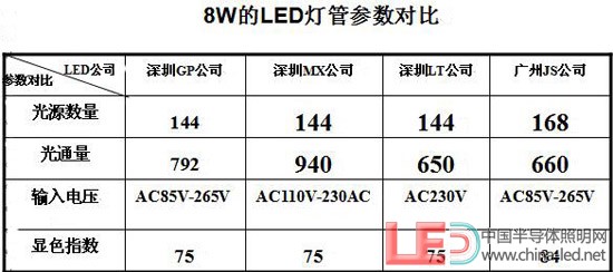 通過上面的表格可以看出,以上我們?nèi)我膺x擇的四家公司的LED燈管的相關結果數(shù)據(jù)有的參數(shù)會有會有一定的差別,選用LED光源的數(shù)量從144-168顆,光通量也從650-940LM,相差的范圍有290LM之多,輸入的電壓有寬電壓,也有窄電壓。顯色指數(shù)基本在Ra=75左右,國家LED燈具標準出臺后會有一個標準和規(guī)范。以上為各廠家自行測試結果(如上圖所示)