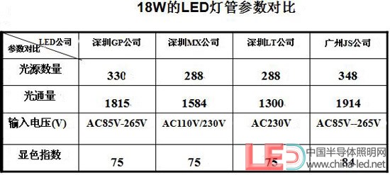 通過上面的表格可以看出,以上我們?nèi)我膺x擇的四家公司的LED燈管的相關結果數(shù)據(jù)有的參數(shù)會有會有很大的差別,選用LED光源的數(shù)量從288-348顆,光通量也從1300-1914LM,相差的范圍有614LM之多,輸入的電壓有寬電壓,也有窄電壓。顯色指數(shù)基本在Ra=75左右,國家LED燈具標準出臺后會有一個標準和規(guī)范。以上為各廠家自行測試結果(如上圖所示)