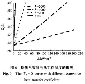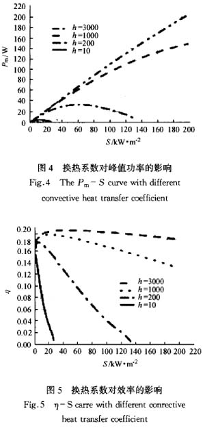 太陽光照射到太陽電池上,一部分轉(zhuǎn)變?yōu)殡?,而大部分卻轉(zhuǎn)變?yōu)闊?,使太陽電池溫度升高,從而影響太陽電池的性能。在同樣條件下,不同的冷卻方式和工況,太陽電池的工作溫度也不同,也就是電池的性能也不同。而冷卻方式和工況的不同主要表現(xiàn)為換熱系數(shù)的不同。圖4—圖6給出了換熱系數(shù)對系統(tǒng)性能的影響規(guī)律。從圖中可以看出,換熱系數(shù)越高,系統(tǒng)的性能越好,而且隨著光強的升高,換熱系數(shù)的影響越來越顯著。