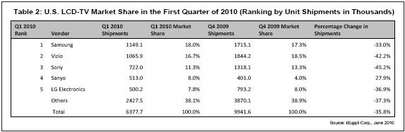 韓國三星從美國品牌Vizio手中奪回第一的排名。第一季度Vizio出貨量比去年第四季度減少42.2%。在美國液晶電視市場,三星與Vizio之間爭得難解難分,每個季度第一的排名都在二者之間頻頻易手。2010年第一季度,三星的份額比Vizio高出1.3個百分點,而2009年第四季度Vizio也領先三星同樣的程度。
