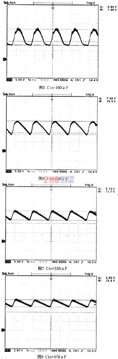 圖5~圖8列出了在不同輸入電容值情況下,輸入紋波Vin:CHl與SW:CH2的變化情形,輸入電容值越大輸入電壓紋波越小,圖5中因?yàn)榧y波太大,造成Vin最小值剛好等于LED導(dǎo)通電壓,這時候PWM全開,如果電容更小時LED導(dǎo)通電壓不足,造成LED會無法發(fā)亮,圖8中電容用330μF就能讓輸入電壓不會過低。(串聯(lián)3顆1WLED)