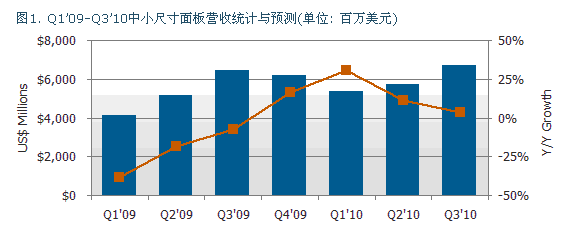 全球中小尺寸面板的出貨在2010年第二季持續(xù)攀升,營收數(shù)字達(dá)到五十四億美元,比去年同期成長百分之三十一。根據(jù)最新的Quarterly Small/Medium Shipment and Forecast Report指出, 這個(gè)市場(chǎng)區(qū)隔預(yù)計(jì)持續(xù)成長,而在2010年第三季的全球營收數(shù)字將會(huì)達(dá)到六十七億美元。