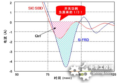 圖2:相比SiFRD(碳化硅快速恢復二極管),SiC-SBD的功率轉換效率大幅提升。(來源:ROHM公司)。