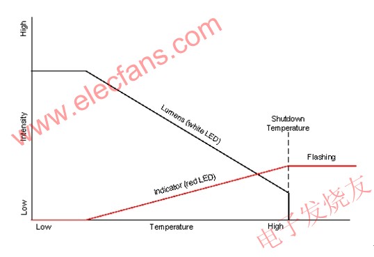 圖2所示系統中的流明下降是通過低功耗的紅色LED指示的。當系統處于最大流明輸出時,紅色LED關閉;當LED燈溫度升高時,流明輸出則會下降,而流明輸出下降時,紅色LED即會開啟。隨著流明輸出不斷下降,紅色LED的強度會相應增加。當流明輸出下降到其最低強度時,紅色LED將會完全開啟。