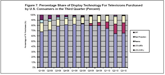 第三季度,大多數美國消費者繼續購買老式的非LED型液晶電視,即CCFL電視。第三季度CCFL液晶電視占總體美國電視市場的份額從第二季度的64.6%升到65.3%,等離子、背投和CRT等其它顯示技術所占份額相應下降。