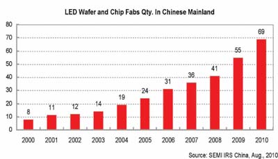 一方面有著對未來市場的強烈預期,另一方面又有各級政府政策的積極配合,在被視為中國LED產業(yè)“軟肋”的上游外延及芯片制造部分,吸引了大量資金的進入。本土企業(yè)三安、德豪潤達、藍光等均紛紛擴產或建設新廠;大陸以外LED巨頭也一改往日的謹慎,加速了在中國大陸的布局。臺灣地區(qū)多家LED大廠,如晶電、鼎元及美國的Cree、SEMILEDs等全球巨頭均已或計劃在中國大陸建廠。中國大陸成為全球LED上游產能增速最快的地區(qū)。