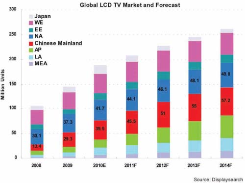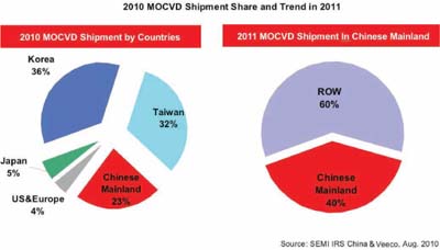 2010年全球MOCVD新增安裝量中,由于受到LED背光在LCD TV滲透的加快帶動下, LCD TV制造強國的韓國增量最多,其次是臺灣地區(qū)。根據SEMI統(tǒng)計,中國大陸今年MOCVD新增量大概在177臺,出貨量居全球第三。另外,根據SEMI統(tǒng)計和分析,結合MOCVD供應情況,2011年中國MOCVD新增量份額有望達到全球的40%,而其它地區(qū)的增量會保持與2010年相當的水平或下降。