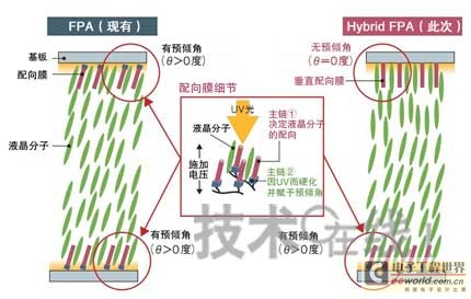 此次開(kāi)發(fā)的Hybrid FPA僅在夾有液晶的一側(cè)基板上使用了賦予預(yù)傾角的配向膜。據(jù)稱(chēng),由此與兩側(cè)均配備賦予了預(yù)傾角的配向膜的原FPA相比,電壓關(guān)閉時(shí)液晶分子的響應(yīng)速度要快(圖1)。而且,在未賦予預(yù)傾角的基板一側(cè),液晶分子幾乎全部沿垂直方向配置,因此可減少漏光。由此比現(xiàn)有的FPA還提高了對(duì)比度。